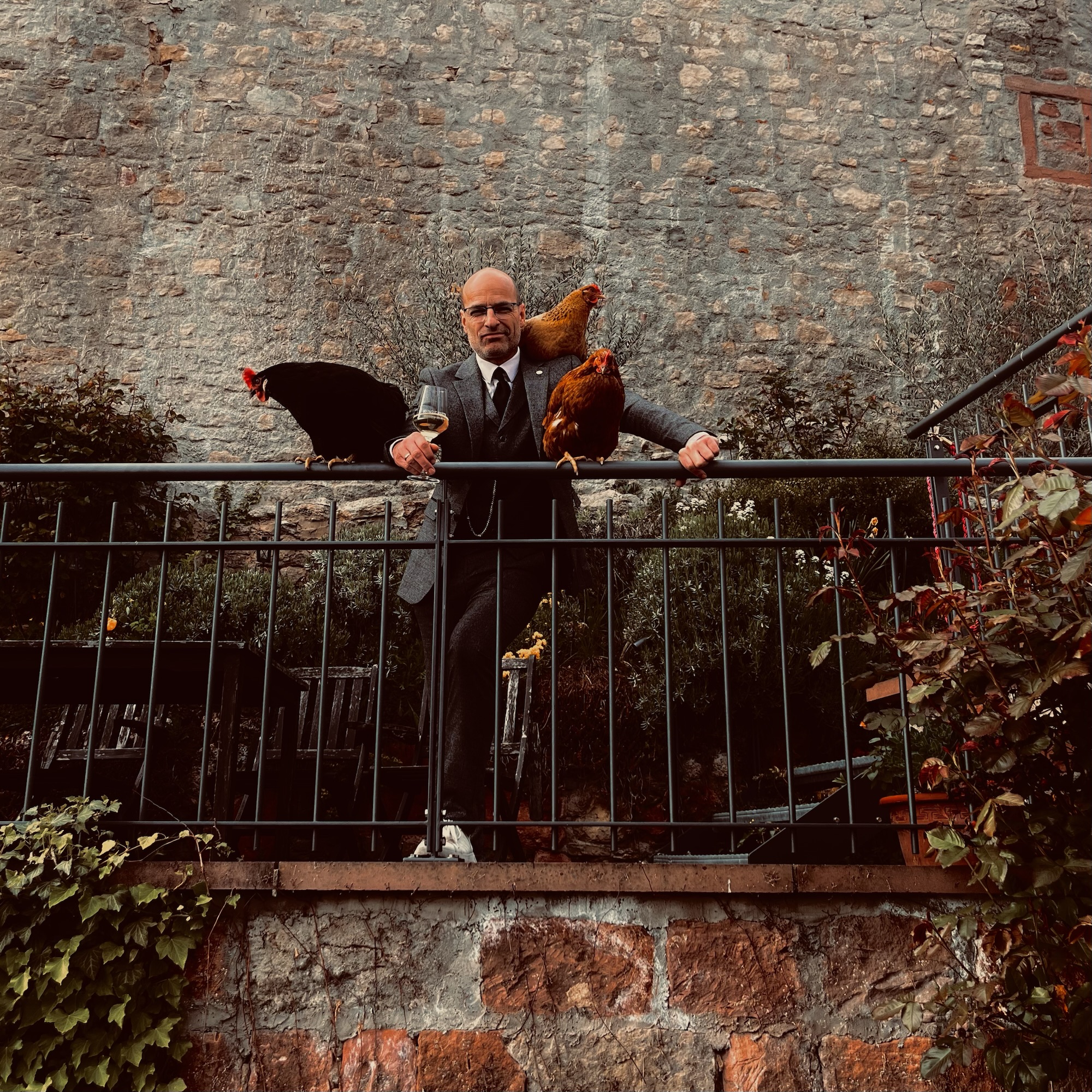 Gemeinsam stehen wir da, die Terrassen-Tetralogie, das Quartett der kleinen Urteile, die göttlichen Instanzen des Ungefragten. Wir halten Wacht. Nicht über das Gute – nein, viel besser: über das Skurrile, das Peinliche, das Unangepasste. Wir sind das moralische Rückgrat der Dorfstraße, nur leicht verkrümmt vom Sitzen.